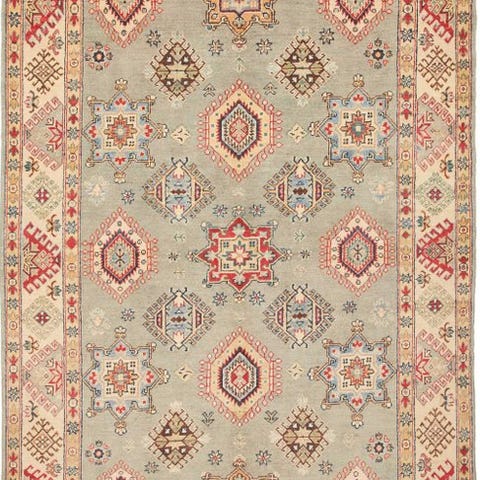 Særdeles smuk Kazak-tæppe med klassisk geometrisk feltdeling og levende ornamenter. Den varme gylden-beige nuance danner en harmonisk baggrund for de farverige medailloner i rød, blå og creme. Den detaljerede bordüre giver tæppet et traditionelt præg, men forbliver moderne og hjemligt.