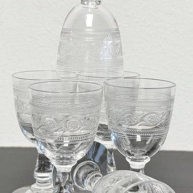 - Egenskaber: Fodglas med gravurmønstre, Baccarat-stemplet synligt under glassene