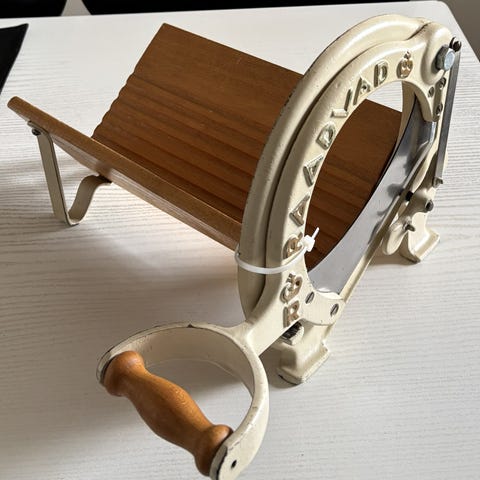 Dette er en håndbetjent brødsnitter fra Raadvad, modelnummer 294.