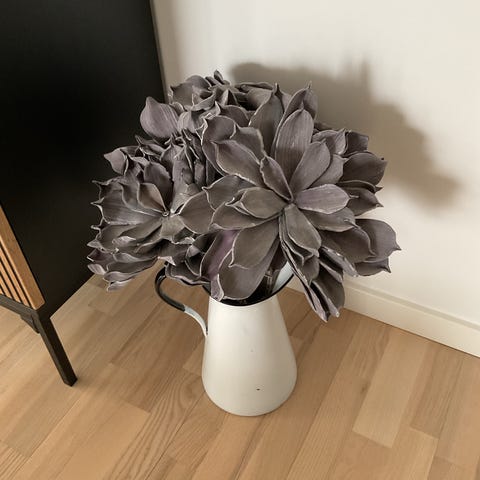 4 langstilket grene med flotte grå dekorations planter. Passer til stor gulvkrukke eller som foto i stor kande (medfølger ikke). Kan sammensætte med andre blomster eller planter. Flotte både inde og ude. Længde 60 cm. Sælges samlet for 100 kr.