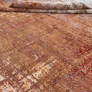 Det moderne abstrakte design med livlige farvetoner i guld, blå, rød og creme giver tæppet en imponerende dybde og dynamik.