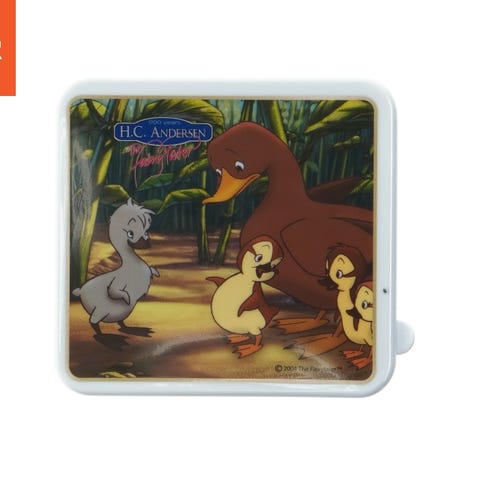 Opbevaringsboks med et motiv fra HC Andersen eventyr. Boksens mål er 13,5x13 cm. Farven på boksen er en lys nuance, og låget har en illustration af den grimme ælling og anden fra fortællingen.