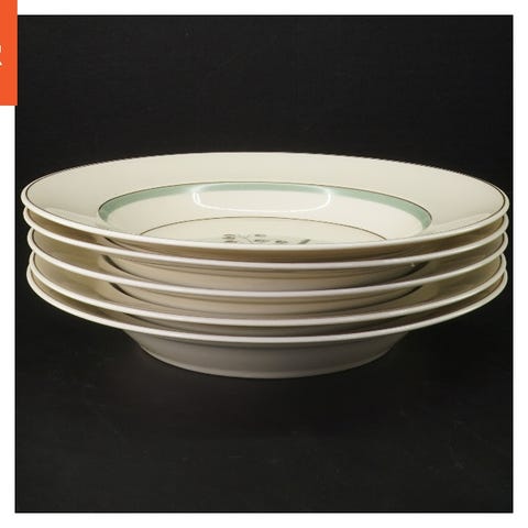 Dette er et sæt af seks tallerkener fra Royal Copenhagen. Tallerkenerne har en diameter på 15 cm og er dekoreret med et planteprint i midten og guldkanter. Farven er primært hvid med grønne elementer. En af tallerkenerne har et synligt afslag på kanten. Bagsiden viser Royal Copenhagen stempel og serienummer 1463. Tallerkenerne tilhører serien 'Grøn Melodi'.