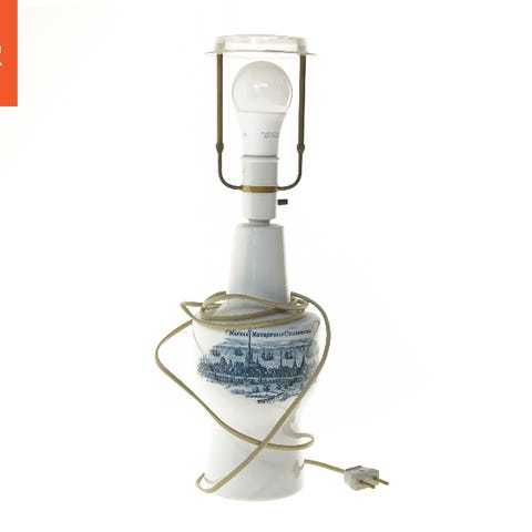 Bordlampe med en base lavet af porcelæn, dekoreret med blå mønstre. Lampen har en transparent skærm og en hvid lyskilde. Størrelsen på lampen er 40 cm. Lampen har en ledning til strømtilslutning. Bunden af lampen viser logoet fra Royal Copenhagen og Fog & Mørup.