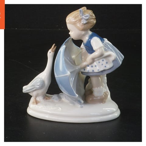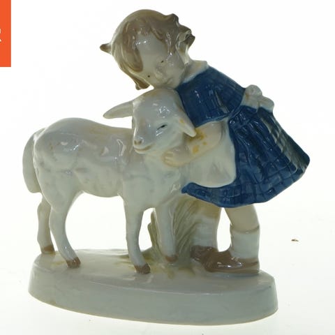 Dette er en porcelænsfigur, der viser en pige, som krammer et dådyr. Figuren er udført i lyse farver som hvid, blå og lilla, og står på en oval base. Størrelsen er 13x11 cm. På bunden er der et mærke med nummer 12 og fabriksstempler. Figuren er et dekorativt element, der kan placeres som pynt i hjemmet. Tags: porcelænsfigur, dekoration, sådyrmotiv