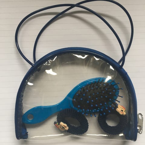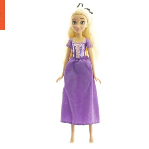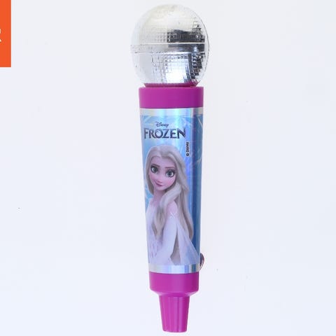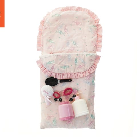 Legetøjssæt bestående af lilla solbriller med motiv fra Disney's Frozen, en blå drikkeflaske, en cremefarvet krukke, en blå kam, og diverse hårtilbehør inklusive elastikker, hårspænder og en hårklemme. Alle dele er designet til leg og er lavet af plastmateriale.