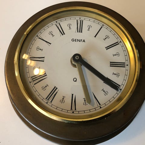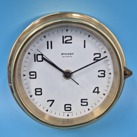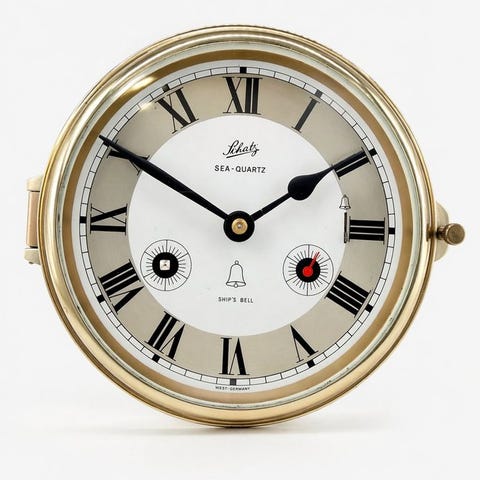 Dette er et skibsur med en kvartsværk. Uret har en messingramme og en hvid urskive med sorte romertal. Det har en traditionel urs hånd og en sekundviserve. På bagsiden findes et batterirum til en AA-batteri. Dimensionerne er 18x9 cm.
