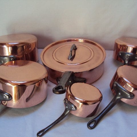 Et sæt kobbergryder tinbelagte i meget god stand, kun opbevaret i et skab, aldrig brugt