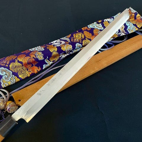 Masamoto Sohonten Yanagiba-kniv Sashimi-kniv – Signeret “正本総本店” – Japansk Sushi-kniv med Saya & Katana-pose