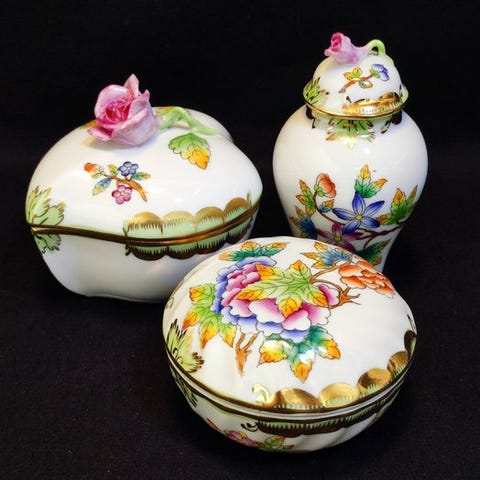Dette er 5 sjældne Herend Queen Victoria (VBO) porcelæns tekopper med underkopper og desserttallerkener kendt for deres håndmalede mønster af peoner, blomster og sommerfugle med en gylden kant.