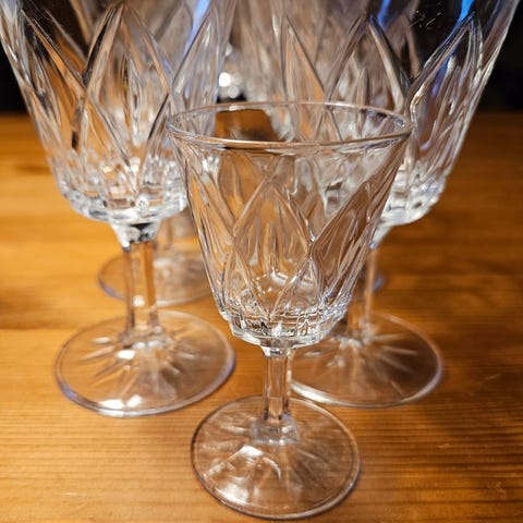 Serie af 5 glas i slebet krystal fra Baccarat-krystalfabrikken, model Armagnac. Denne model, fremstillet mellem 1950 og 1990, har et mønster af skæl der smukt reflekterer lyset. Alle glassene er mærket med Baccarat-stemplet (se billeder).
