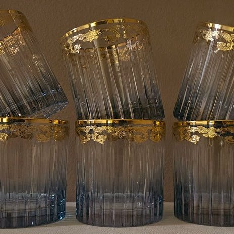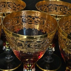 Pragtfulde vinglas i utroligt elegante farver, vidunderligt udskåret og hånddekoreret, unikke i deres slags, færdige med store og dyrebare dekorationer i 24 kt guld, udskåret, i ægte muranestil.