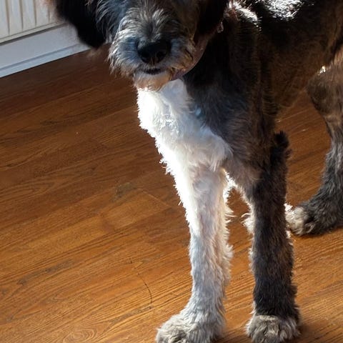Hun er blanding af gd og bernensennen. Hun vejer ca lidt over 40 kg.