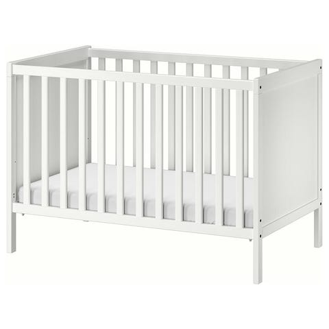 IKEA tremmeseng i hvid. Klassisk tremmeseng med netbund og tremmer hele vejen rundt. Sengen er velegnet til baby og mindre børn. Madrassen måler 120 x 60. Sengehest medfølger.