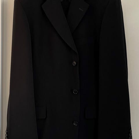 Lukkes med 2 knapper. To slidser bag og 4 knapper på ærmerne.