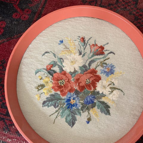 Broderi med motiv af en rund blomsterkrans i flere farver på hvidt stof. Motivet består af forskellige blomster og blade, der danner en cirkel med åben midte.
