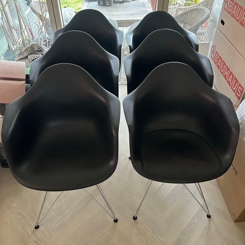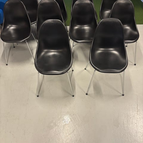 Sælger 7 stk sorte stole i klassisk Eames style med Eiffel stel – et tidløst og minimalistisk design, der passer perfekt ind i både moderne hjem, kontor eller showroom.