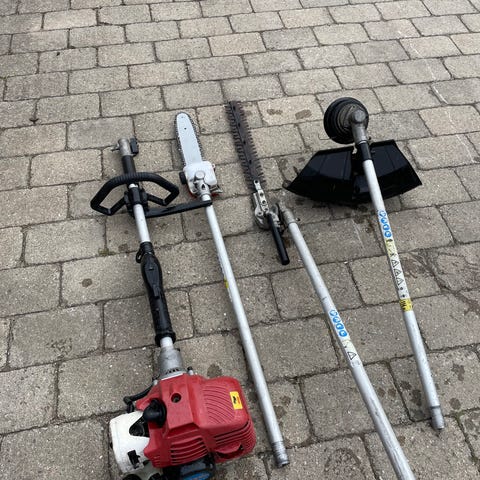 Have-/multimaskine benzindrevet med flere redskabsdele