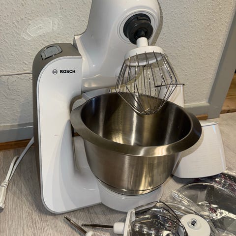 Bosch køkkenmaskine i hvid med rustfri stålskål. Medfølgende alt ekstratilbehør bl.a piskeris og dejkroge, der kan opbevares i den medfølgende taske. Der følger også citruspresser, ekstra skål med låg, blender og presser samt manualer og instruktionsmateriale. Velegnet til almindelige køkkenopgaver som æltning, piskning og presning af citrusfrugter. Alt ekstraudstyr har aldrig været brugt undtagen dejkrogen og piskeris