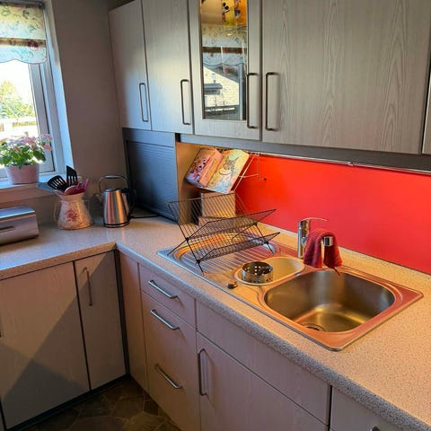 Retrokøkken med over- og underskabe i massivt træ. Kan ses efter aftale. Køber skal nedtage køkkenet selv.