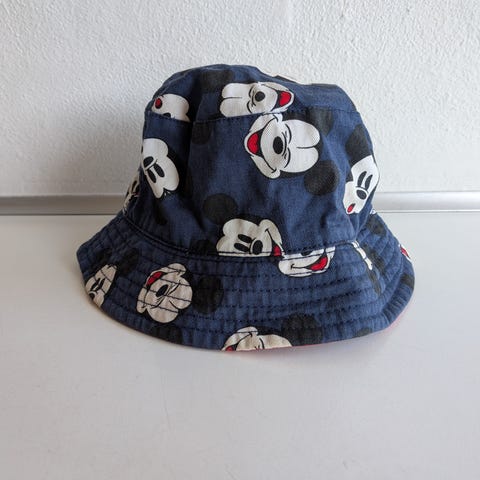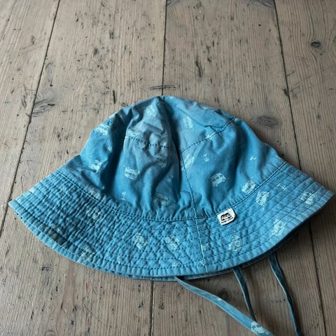 Solhat til børn, str. 110, unisex. Hatten er blå med hvidt ankerprint på den ene side og blå-hvide striber på den anden side, med rød kant langs skyggen. Egnet til hverdagsbrug og udendørs leg, hvor der er behov for let solbeskyttelse af hoved og ansigt. Bøllehattens tynde stof gør den velegnet på stranden eller pool, da den tørre hurtigt hvis den skulle blive våd. Passer til barn ca. 3 til 7 år.