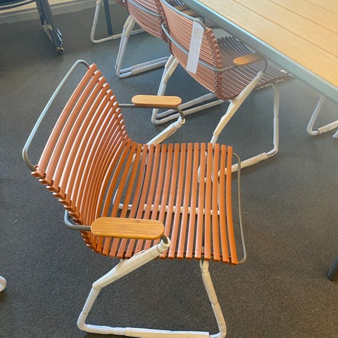 Flotte spisebordsstole fra CLICK serien, med hvide plastik lameller, som sikrer en god siddekomfort.