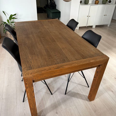 Spisebord, Egetræ, Ilva l: 230, Lækkert massivt egetræsbord sælges. Det er i farven espresso og fremstår i flot stand, med meget få brugsspor. Det måler 2.30 uden plader, der medfølger 2 tillægsplader som hver måler 51 cm.