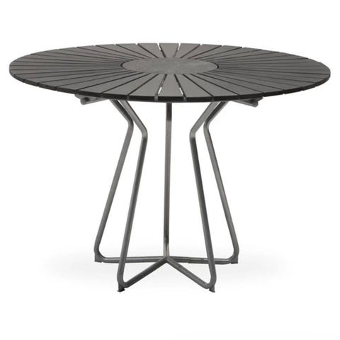 ILVA Circle rundt havebord, 110 cm i diameter. Circle er skabt med en robust bordplade i olieret bambus, der tåler både sol og regn, og et stel i stålgrå metal, der sikrer stabilitet. Bordets midte er udsmykket med en smuk granitdetalje, som giver det et unikt udtryk.