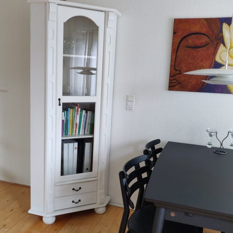 Anvendeligt som bogskab, linnedskab, vitrineskab.