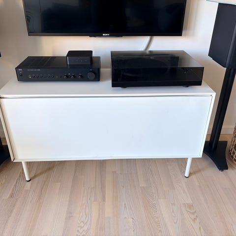 I den ene side finder man en LP-skuffe, der kan skubbes ud med et let tryk. Og i den anden side er der hylder med plads til forstærkere og lignende. Der er tilgang til kabler flere steder fra bagsiden, og gennemgang til kabler mellem rum og hylder.