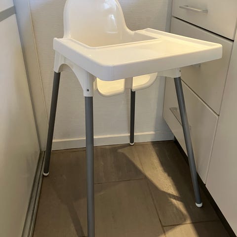 IKEA højstol i hvid plast med grå ben. Stolen har enkel sædeenhed med ryglæn og integreret sikkerhedssele. Benene kan afmonteres for nem opbevaring og transport. Velegnet som spise- og siddeplads til mindre børn ved bordet.