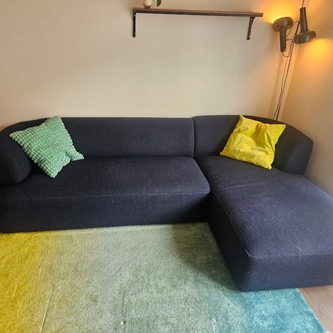 Ilva 3-personers sofa i beige stof. Sofaen har chaiselong i den ene side. Ben i lyst træ, og med en dejlig siddehøjde på 44 cm.