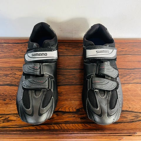 Shimano cykelsko i størrelse 43 i hvid og sort. Skoene har velcrolukning og kraftig sål med klampebeslag til klikpedaler. Velegnet til cykling, hvor der ønskes fast forbindelse mellem sko og pedal. Farvekombination i hvid, sort og røde detaljer på sålen. Et nyt sæt klamper medfølger.