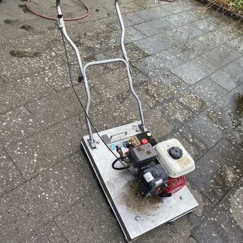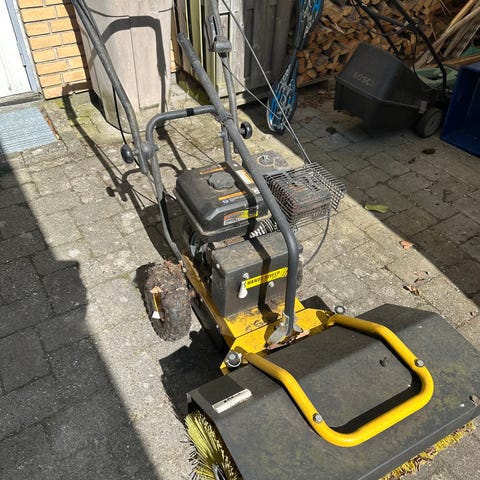 Texas Handy Sweeper fejemaskine til udendørs brug. Benzindrevet kostemaskine med frontmonteret roterende børste i gul farve. Maskinen er velegnet til fejning af fliser, indkørsler og andre faste udendørs belægninger. Styrebøjle bagtil og hjul gør den nem at manøvrere. Egnet til privat eller lettere professionel brug afhængigt af behov og underlag.