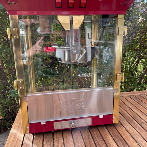 Popcorn maskine i bordmodel med retrodesign i rød og hvid. Maskinen har gennemsigtige sider og en indvendig metalgryde til opvarmning af majskorn. Udstyret med låg og håndtag på døren samt strømledning til almindelig stikkontakt. Velegnet til fremstilling af popcorn i hjemmet, til fester eller andre arrangementer, hvor der ønskes frisklavede popcorn. Brugt få gange