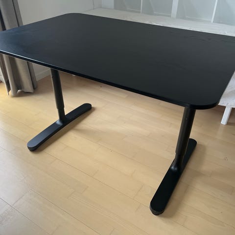 Klassisk sort bord, hvor ledningerne kan samles under skrivebordet.