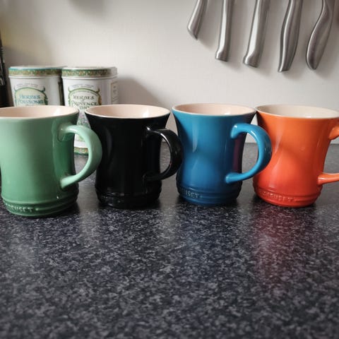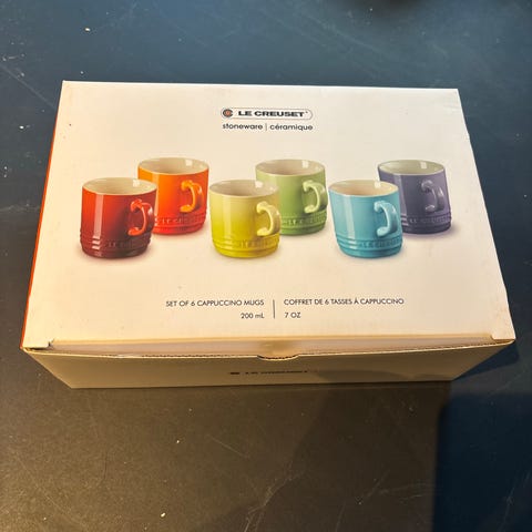 Jeg sælger 6 smukke Le Creuset espressokopper i stentøj på 1 deciliter. Yderside i mat sort og lys/beige inderside. Sættet består af seks kopper med hank. Velegnet til espresso eller lignende i køkken og spisestue.