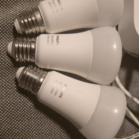 3 stk. Philips hue pærer. Sælges samlet. Stadig i emballage og aldrig brugt. Normalpris pr. stk. ca. 200,-. Sælges samlet for 350,-