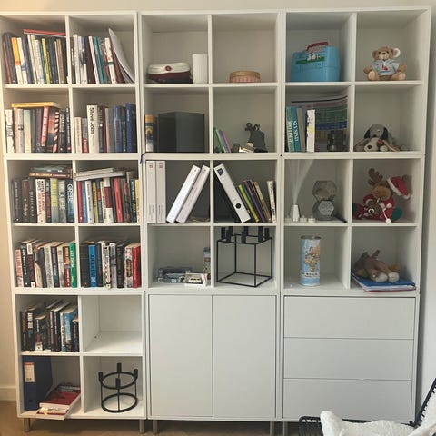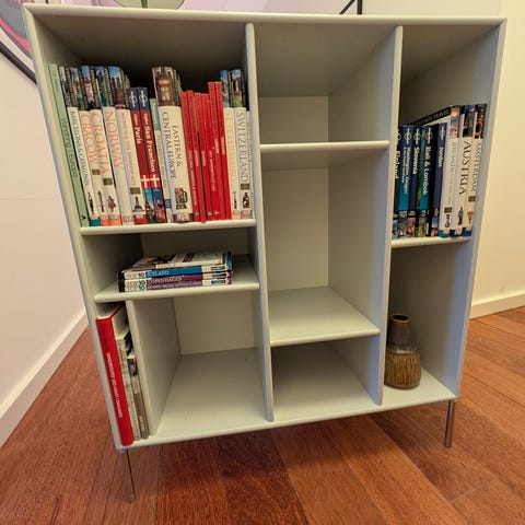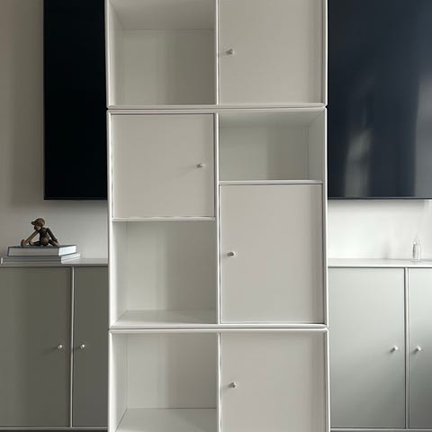 Montana reolsystem designet af Peter J. Lassen. Reolen består af flere modulopbyggede reolkasser, som er samlet til en lodret væghængt løsning. Systemet giver plads til opbevaring af bøger, dekoration og andre genstande. Velegnet til stue, kontor eller læsehjørne, hvor der er behov for åben opbevaring og udstilling af ting.