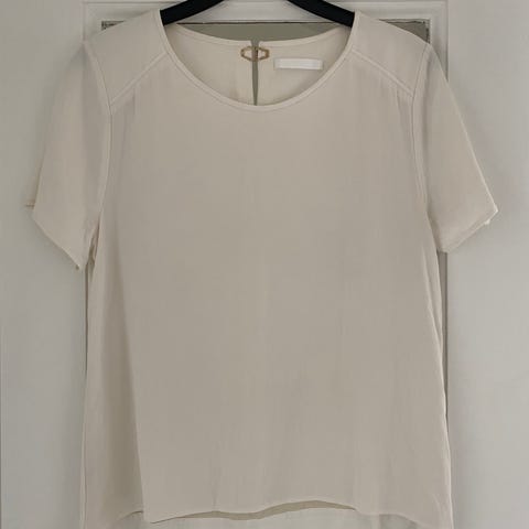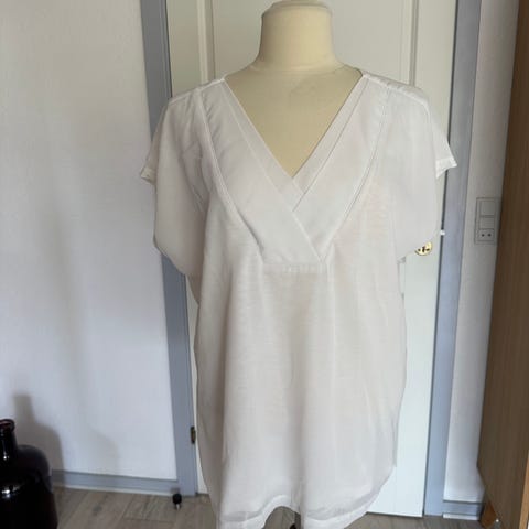 Fransa bluse til kvinder i str. S. Blusen er hvid og fremstillet i viskose. Den har korte ærmer og V-udskæring med let rynkedetalje ved halsen. Løs pasform og lige kant forneden. Velegnet til hverdagsbrug eller som enkel overdel til både bukser og nederdele.
