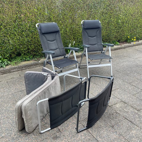 2 stk. Campingstole sammenklappelig i grå farve med polstret sæde og ryg. Stolen har armlæn og justerbar ryglæn, samt metalstel. Velegnet til camping, terrasse eller havebrug, og kan foldes sammen for nem opbevaring og transport. Samlet pris 600,- kr.