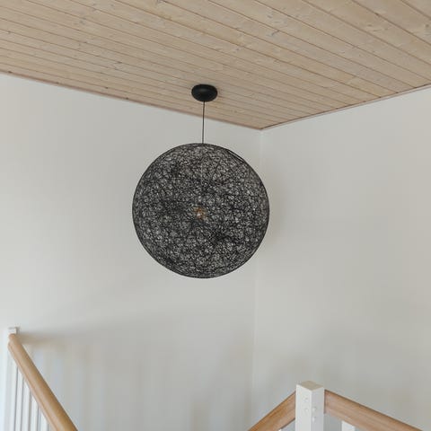 Der ligger ekstra lampe ledning i ophænget så man kan få den til at passe til sit rum.