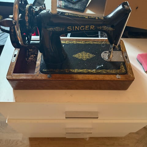Ældre model singer symaskine, brugt, men virker stadig. Instruktionsbog medfølger og opbevaringskasse.