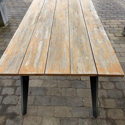 Solidt havebord i massivt træ med en diameter på 100 cm. Bordet har en stabil konstruktion og plads til 4 personer. Det står med naturlig patina, men kan nemt blive som nyt med en hurtig afvaskning og lidt olie.