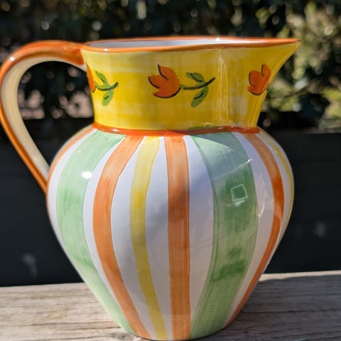 Bassano kande i keramik med håndmalet blomsterdekoration i smukke farver. Kanden har udskårne og svungne detaljer ved hank og tud samt reliefblomster på midten. Overfladen har en lys, let patineret glasur med malede blomster og grønne blade rundt om korpus. Egnet som dekorativ genstand, eksempelvis som pyntekande eller til tørrede blomster.