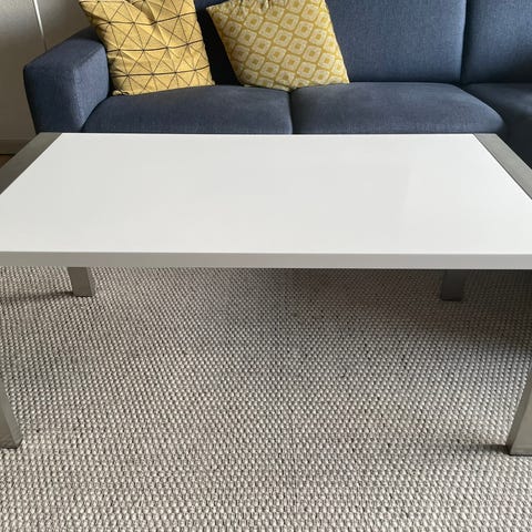 IKEA sofabord med rektangulær bordplade i hvid finish og stel i metal. Robust og maget stabil.Bordet har lige ben i metal, der er fastgjort i hjørnerne med synlige beslag og skruer. Velegnet som sofabord eller lavt sidebord i stue eller opholdsrum.Maget nemt for at skile af.Nypris , 4 år siden var 1300kr