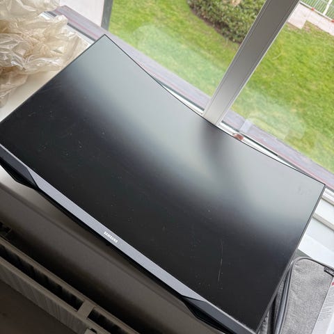 Buet 24" computer skærm i sort. Skærmen er egnet til brug med stationær computer, f.eks. til kontorarbejde eller gaming. Buet panel giver et mere omsluttende billede end en flad skærm i samme størrelse. Skærmen står på en fod med tre ben og tilsluttes via de porte, der findes på bagsiden (ikke vist på billederne). Velegnet til skrivebord med begrænset plads på grund af den kompakte 24" størrelse.