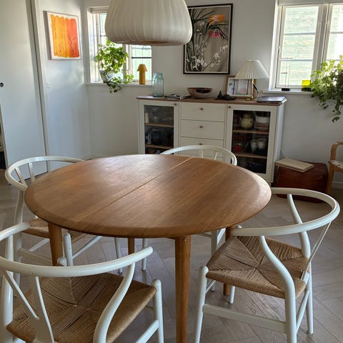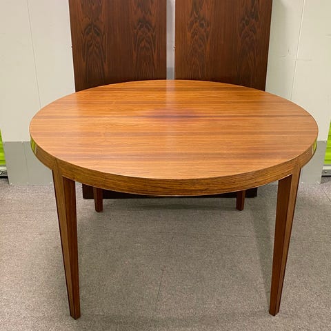 FDB. Lækker rundt spisebord i massiv bøgetræ med udtræk, to tillægsplader. H. 72 cm. Tillægsplader 50 cm. Spisebord med plader totallængde 220 cm. Fremstår i super stand. Evt kan lev aftales