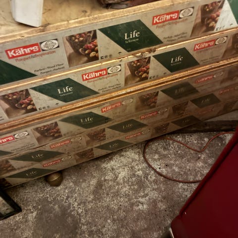 Pænt massivt klik trægulv i Merbau (Afrikansk teak). Der er ca. 48 hele gulvbrædder som måler 220x19x1,4cm (4mm Merbau på 10mm lyst træ). Derudover er der en del kant og endestykker. Gulvet har dækket et stuegulv på 29kvm og jeg tænker der nu kan lægges et gulv på ca. 25kvm. Gulvet er pænt, men lidt støvet. Er meget nemt at lægge og skal ikke limes.