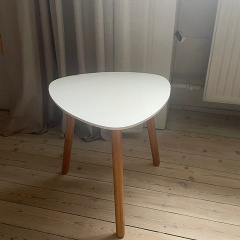 rundt bord . Bordet har rund bordplade i lys blå farve og understel i bøjet birketræ med tre ben. Egnet som sidebord, sofabord eller lille spise- eller cafébord i stue, køkken eller entré. På billederne ses brugsspor langs kanten af bordpladen.